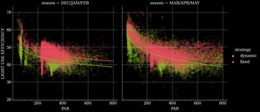 Gardin data showed that the fixed lighting strategy resulted in 4% more photosynthesis (Fig.1), driven by higher light use efficiency at all light intensities. This is reflected in a higher plant health (Fv/Fm) for the fixed strategy, suggesting a stress response was triggered in the dynamic lighting, consistent with the hypothesis of reduced investment into electron transport proteins.