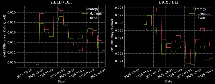 Figure 2. Left: Yield efficiency (kg/m2/mol) from December to April in dynamic (green) and fixed strategies. Right: BRIX / DLI (/mol) from December to April in dynamic (green) and fixed strategies. Fixed strategy generated 5% more brix per mol.