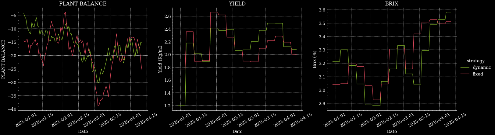 Figure 3. Left: Gardin's Plant balance. Middle: Delphy Tomato Yield. Right: Delphy Tomato Brix. Crop imbalance reduced fixed-strategy yield by 0.3 Kg/m2.