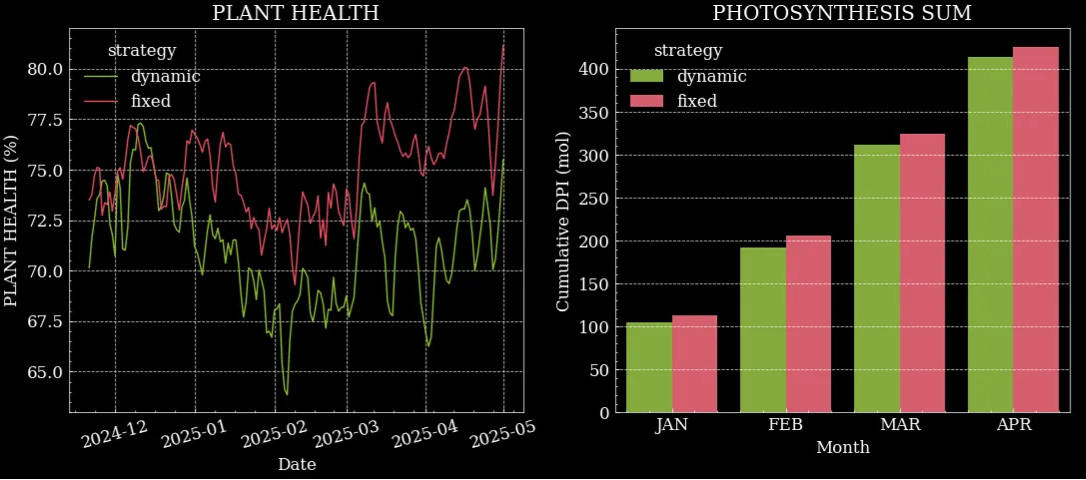 The fixed lighting had typical LED lighting before sunrise, whereas the dynamic lighting dimmed the lights to maintenance respiration for three hours during peak electricity prices (6-9 am). Both compartments received the same total DLI by increasing the dynamic lighting intensity during non-dimmed periods. The key research question was whether short-term energy savings might come at the cost of long-term crop performance.